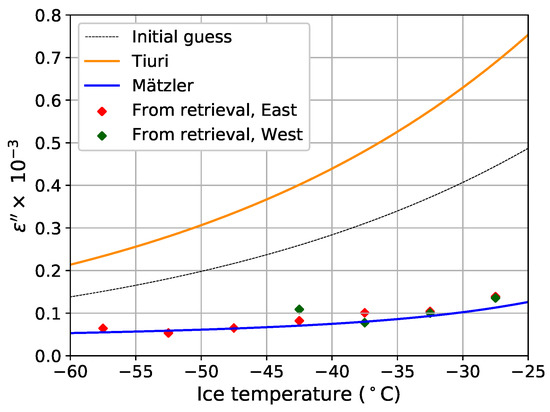 The best fit value for the e-folding depth generally decreases with temperature from 560 to 216 m, (Table 1), as expected from the dependence of to temperature. Though, the algorithm finds a lower value at than at C in East Antarctica, and a lower value at than at C in West Antarctica. These two unexpected results illustrate the sensitivity of our method to effective inputs and to our particular choice of temperature slices used. Nevertheless, these best-fit values remain within a consistent range of values compared to the general evolution of e-folding depth with temperature. Similarly, the discrepancy between East and West Antarctica for a given temperature slice is not systematic. Figure 5 shows the variations of the permittivity imaginary part deduced from the best fit of (Equation (3)), and compared to the permittivity models of Tiuri and Mätzler. Between and C, our estimates closely fit with the Mätzler curve, with a discrepancy of only (root mean square error), or 5% of Mätzler value. Such good agreement with the Mätzler model is a strong result of this study, as our estimates are completely independent, even though several approximations of our method may affect these results. Hypothesis 2 presented in Introduction is the most valuable. This result raises questions about the emissivity and the source of scattering.