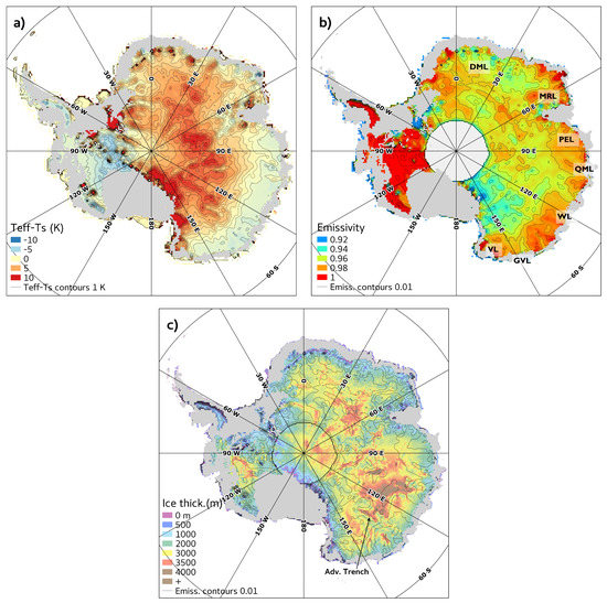 Areas undergoing more than five days of melt over the 1979–2007 time period are masked in grey and were not taken into account in the study. (a) Difference between and (K). Contour lines are 1 K apart. (b) Emissivity spatial variations as computed from the Mätzler model. DML: Dronning Maud Land, MRL: MacRobertson Land, VL: Victoria Land, GVL: George V Land, PEL: Princess Elizabeth Land, QML: Queen Mary Land, WL: Wilkes Land. Contour lines are 1% apart. (c) Ice thickness (m) from Bedmap 2 [55]. Emissivity contour lines are superimposed.