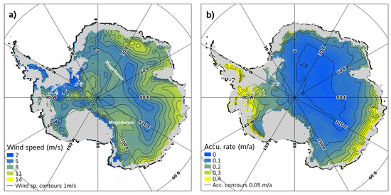 (a) Average wind speed (m s) at 10 m from ERA-Interim [46]. Contour lines are 1 m s apart. (b) Accumulation rate at the ice surface from Arthern et al. [4]. Contour lines are 0.05 m y apart.