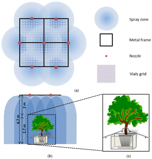 Top view of simulator spray zone with vials grid (a); Rainfall simulator cross-section view (b); small plastic roof attached to the tree and plastic sheets to prevent water from dripping into the pot (c).