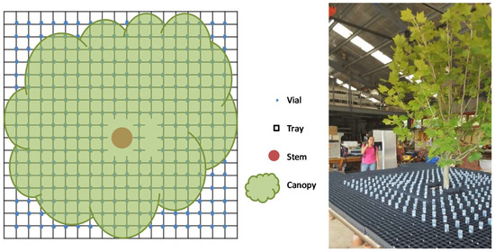During measurements of water storage capacity for trees in their full (100%) canopy, total throughfall was measured using small graduated plastic vials (50 mL, opening diameter 2.8 cm, model PP, Sarstedt Inc., Germany). Vials were evenly distributed under the canopy in an 11-cm spaced grid of 18 × 17, with 9 vials being excluded to fit the tree stem (n = 297). These vials were held in place by plastic trays attached to tables to ensure they were truly vertical in orientation and in exactly the same position under each rainfall simulation (Figure 2). Vials were labelled according to their position in the grid and remained in position during the 15 min of rainfall simulation followed by 15 min of post-rainfall dripping. After these 30 min, vials were weighed on a 2-decimal place balance (3100 g capacity, 0.01 g resolution, GF3000, A&D Weighing, Thebarton, Australia). Any water on the outside surface of a vial was wiped away before weighing. The average mass of a plastic vial was subtracted from the total mass and the remaining mass converted to water volume (mL), assuming the density of water as 1.0 g/mL. Each water volume was then converted to water throughfall (mm) by dividing the mass by the area of the opening of the vial (6.16 cm2). The vials covered about 5% of the total area under each tree canopy.