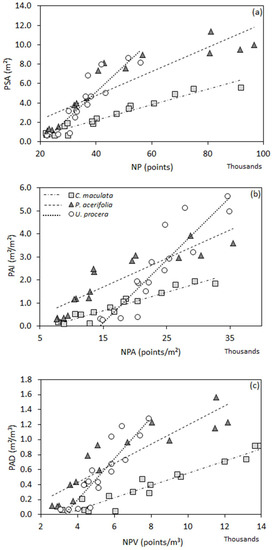 Linear regressions between TLS-derived metrics and plant surface metrics. (a) Number of points (NP) × plant surface area (PSA); (b) Number of points per canopy area (NPA) × plant area index (PAI); (c) Number of points per canopy volume (NPV) × plant area density (PAD).