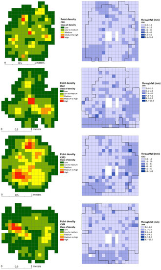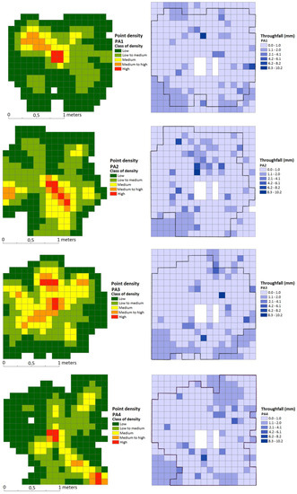 Statistical analyses have shown a significant correlation between throughfall reduction zones and denser canopy for U. procera and P. acerifolia. A higher density coincides with areas of lower throughfall because it corresponds to a larger plant surface to store water [60]. However, some trees present hotspots with high values of throughfall under an area of high point density in the middle of the canopy projection area. As can be seen by overlapping the throughfall redistribution with the point density map, the canopy structure may be influencing the redistribution process, as the arrangement of leaves and branches in this region conducts the water that has dropped from other layers to the bottom.