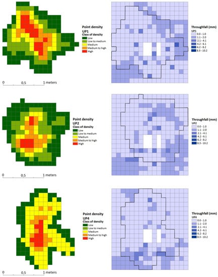 In the subcanopy analysis, a slight similarity of the canopy contour may be noticed in the throughfall distribution map when overlain by the canopy density map, showing the greater value of throughfall in areas around the canopy’s dripping edge (Figure 5, Figure 6 and Figure 7). During this experiment, two trees needed to be replaced (UP2 and UP3), and unfortunately, UP3 was not scanned and not counted in this throughfall analysis.