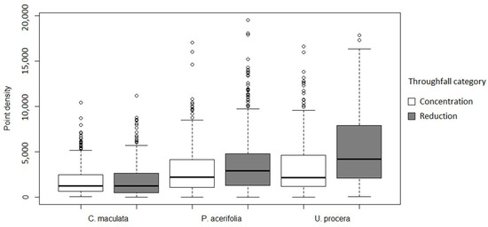 Box plots of the distribution of point density into the two different throughfall categories for each species.