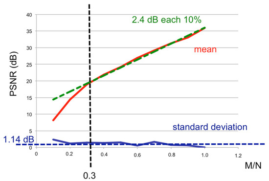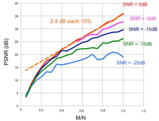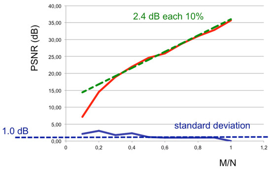 In simulated data, we have noted that PSNR increases linearly of 2.4 dB for each 10% increase of M/N. This relationship is perfectly confirmed also for these experimental data as shown in Figure 10.