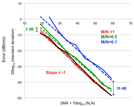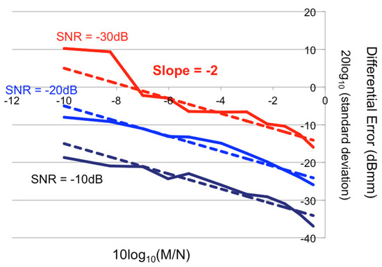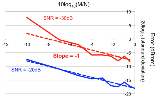 When M/N increases, the number of samples increases too. So the error should decrease. This intuitive idea has been verified with a simulation. Figure 7 shows how the error decreases increasing M/N, for two different values of the SNR. Both the plots are approximately straight lines with slope −1.