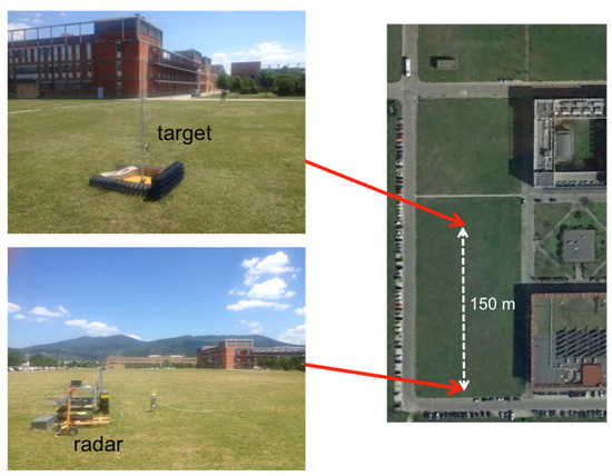 The CS techniques have been tested in a controlled experimental test site at the University of Florence (named “Campus”). A single metallic target, provided with a micrometric linear translator, has been positioned in front of the radar equipment at 150 m distance in a large flat garden, as shown in the pictures in Figure 9.