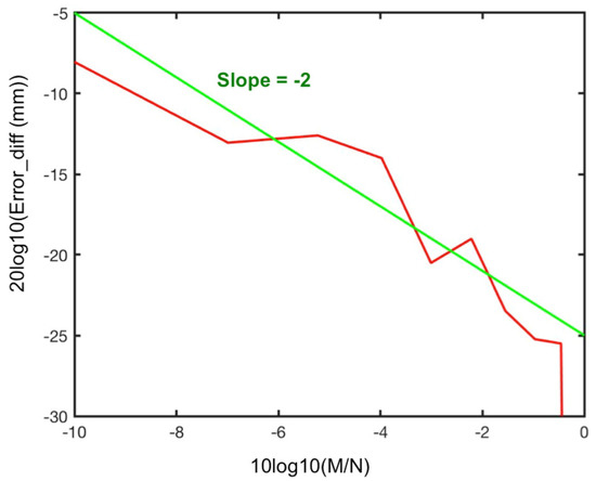 For evaluating the interferometric error we acquired 100 measurements in 96 h. By considering one pixel associated to a stable point of one building at about 200 m in the background, we evaluated the standard deviation of the displacement retrieved by interferometry. Figure 11 shows the obtained values varying M/N. The error is rather constant. It means that thermal (Gaussian) noise is not the main source of error. The effective contribution of thermal noise is more evident in the plot of the differential error (Figure 12) that confirms the error (in log scale) linearly decreases with slope −2, increasing the M/N (in log scale), as predicted by simulation.