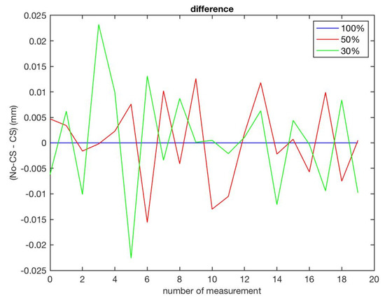 Differences between displacements detect through 100% CS, 50% CS, 30% and displacements detected using 100% of data without application of CS techniques (test site “Campus”).