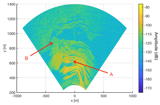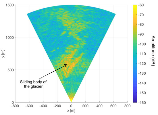 As test-site representative of a natural scenario we considered the “Belvedere” glacier in the Italian Alps. The data was acquired during a measurement campaign in 2006, whose details are reported in [3,27,28]. The measurement parameters were: f1 = 5.97 GHz, f2 = 5.99 GHz, Nf = 801, L = 1.71 m, N = 141. The obtained radar image (without application of CS techniques) is shown in Figure 24.