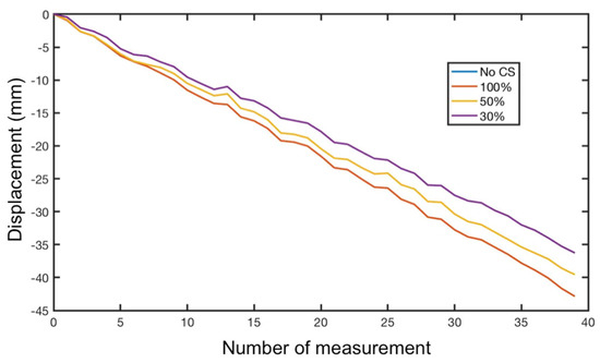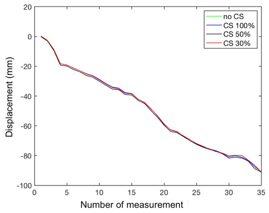 In order to verify the capability of CS to detect a cumulative displacement, we have taken into account a pixel inside the sliding body of the glacier. Figure 25 shows the plots obtained without CS and with CS applied to 100, 50, and 30% of data. The plots are almost perfectly overlapping.