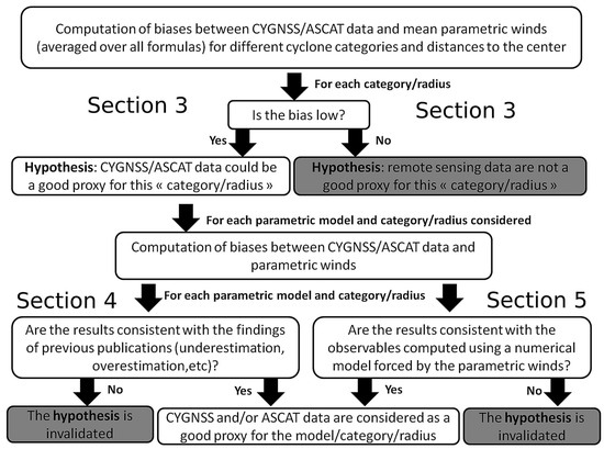 The main finding of this paper is the following: Satellite remote sensing is now mature enough to provide relevant information about the structure of wind fields in cyclones, and can be used to assess the performance of parametric cyclonic wind models. Further work is yet needed to retrieve the detailed structure of TCs close to the eyewall. We focused here mainly on CYGNSS and ASCAT, but there is little doubt that other types of data may also be valuable. Remote sensing has now become a powerful tool that should be used to validate or improve existing parametric approaches, in order to conduct better wind, wave, and surge analyses for TCs.