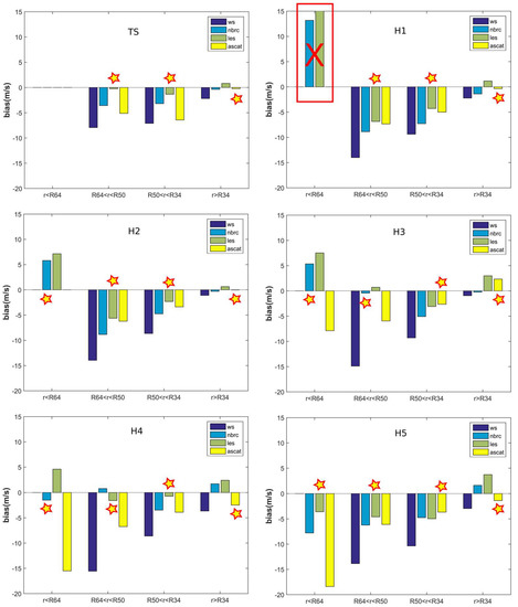 Bias between the remote sensing data and the parametric winds averaged over all empirical models. Negative (resp. positive) values indicate that remote sensing data display lower (resp. higher) wind speeds compared to the mean parametric winds. Different categories of distance to the cyclone center (r) and cyclone intensities are considered. TS stands for tropical storms, H1, H2, H3, H4, and H5 to the Saffir-Simpson hurricane category (Cat 1, 2, 3, 4, and 5, respectively). R34, R50, and R64 are the radii for the 34-kt, 50-kt, and 64-kt winds. ws, nbrc, and les are three different CYGNSS products (see Section 2). The stars indicate which product has been selected as proxy for wind speeds in Section 4 and Section 5. The red box/cross shows the intensity/category class for which CYGNSS/ASCAT data are not expected to give adequate information about wind speeds.