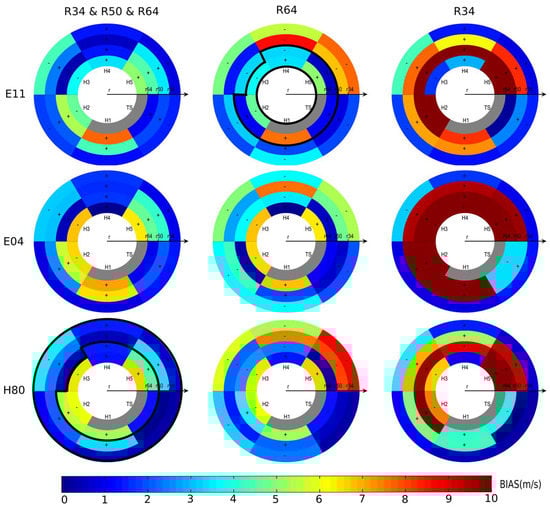 Regarding ASCAT data, Figure 2 shows that the bias is low (less than about 2 m/s–3 m/s in absolute value) for wider radii than R34, but becomes increasingly negative with larger wind speeds, up to almost −20 m/s for category 5 cyclones and smaller radii than R64. These results suggest that ASCAT data are a good proxy for wind speeds lower than 34-kt, but that they underestimate extreme winds. This conclusion is consistent with previous published papers [48] based on methodologies and datasets different from ours.