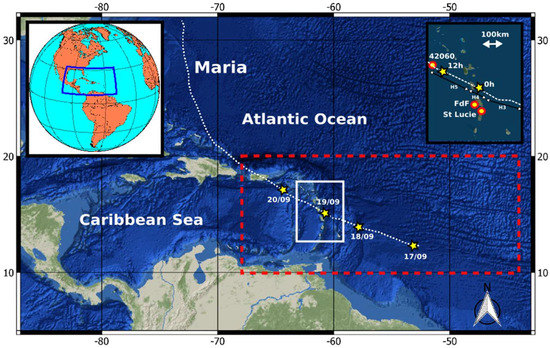 The reader is referred to Zhang et al. [50] and Krien et al. [9] for greater details about the model and the numerical strategy. Here, we compare the significant wave heights (Hs) computed by the model with Hs recorded by three buoys located in the Lesser Antilles (Figure 5): Fort de France (FdF) and Sainte Lucie, owned by Météo France, as well as 42060, maintained by the National Data Buoy Center (NDBC). The latter went adrift during the peak of Maria, hence the decrease in Hs was unfortunately not captured.