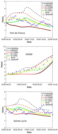 Figure 6. Significant wave height time series for different parametric models. “R64” denotes a model constrained only by the 64-kt wind radius. “ALL” indicates a model constrained with all the available information (34-kt, 50-kt, and 64-kt wind radii). E11H80 corresponds to a blend of the model E11 (for the inner core region) and H80 (for the outer region). M16b is the result of a blend between wind speeds obtained from M16 constrained by R64 only and with all wind radii information. Results for Fort-de-France, 42060, and the Sainte-Lucie station are displayed in the upper, middle, and lower panels, respectively. - E11 and H80, constrained using all the wind radii information (E11(All) and H80(All) in Figure 6);