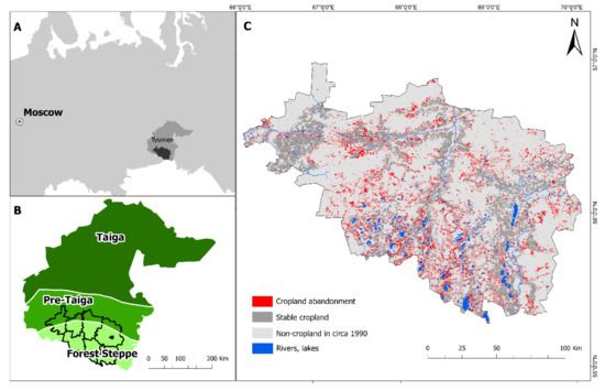Location of Tyumen province and the study area (darker grey area, panel A), ecozones of Tyumen region (B), and change map from the remote sensing classifications for ca. 1990 and ca. 2015, highlighting areas of cropland abandonment and stable cropland (C).