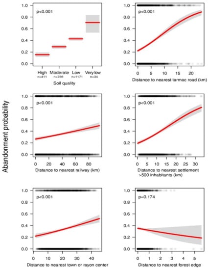 Predictions of cropland abandonment probability from univariate logistic regression models. p-values indicate significant associations between abandonment probability and the respective variable. Models are plotted with standard errors (grey intervals). The data is overplotted (0—samples of stable cropland, 1—samples of abandoned cropland).