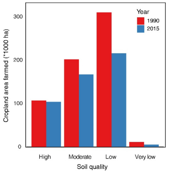 Area of farmed cropland per soil quality category in 1990 and 2015.