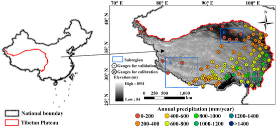 Precipitation is commonly regarded as one of the most important variables in hydrology, meteorology, climate change, etc. [1]. Therefore, long-term precipitation information is in great need in related scientific and application fields. It is a great challenge to monitor and measure precipitation amounts and trends in particular in areas with complex terrain, for instance the Tibetan Plateau (TP). TP is the largest plateau in the world with an average elevation of >4000 m [2], which has also been identified as the pilot region to study climate fluctuations in the world due to its sensitivity to climate change. The temperature in TP has been rising since the 1950s [3], and precipitation shows an increasing trend since the 1990s [4]. However, the rain gauge network is significantly scarce over the TP due to its harsh environment and complex terrain [5], which makes it difficult to obtain spatially explicit precipitation information over the plateau. Additionally, strong variability in physiography can lead to localized variations in climatic conditions, needing much more information on the critical climatic variables, i.e., precipitation. Therefore, to investigate the regional climate fluctuations in the TP, long-term precipitation estimates with both finer resolutions (~1 km) and better accuracy are in great need.
