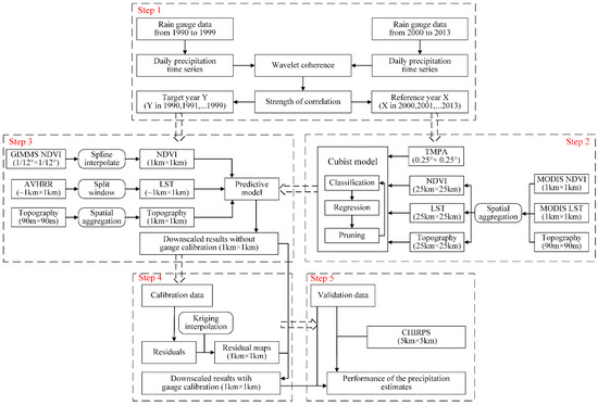 Figure 2. Flow chart for obtaining retrospective precipitation estimates at ~1 km, in 1990s, using wavelet coherence and Cubist. - (2)