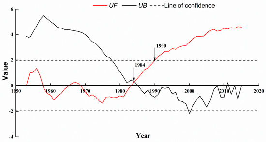 For all , a curve was designed as UB. could be considered as normal distribution under the null hypothesis. For this study the confidence interval was taken as , which indicated that if the absolute value of was larger than 1.96, the trend was considered to be significant at the 95% confidence level. The negative reflected a decreasing trend while the positive value of represented an increasing trend in the time series. The intersection of and curves represented the approximate mutation time of the trend within the precipitation time series.