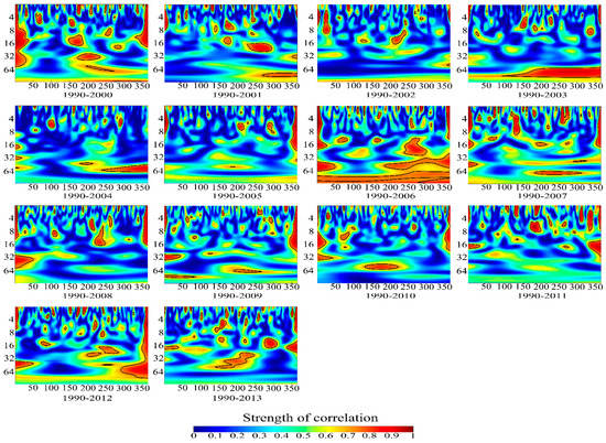 Hereafter, the correlations and similarities of precipitation patterns in each target year, from 1991 to 1999, and the corresponding reference year, from 2000 to 2013, were matched. The wavelet coherence results based on the correlations of precipitation patterns in the target years from 1991 to 1999 and its corresponding reference years were shown in Figure 6. Similar to the situation in 1990, there were also limited correlations of precipitation patterns detected in discrete period at a very short period scale (<8 day) and short period scale (8–16 day), respectively. However, the strong correlations were always determined at long period temporal scale (>64 days), indicating the precipitation patterns in two independent years were correlated well at the bi-monthly scale.