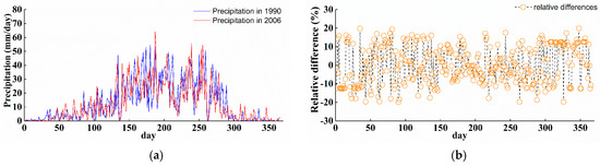 The line chart of (a) precipitation variations in 1990 (blue lines) and those variations in 2006 (red lines); and (b) the relative differences of precipitation in 1990 and 2006.