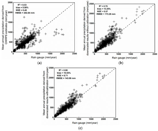 To compare the performances of the DS, both without and with rain gauge calibration, with those of CHIRPS data, we validated these precipitation products against ground observations for the period from 1990 to 1999. The validation of CHIRPS data was shown in Figure 8a, while Figure 8b,c displayed the validations of the DS without rain gauge calibration and those with rain gauge calibration, respectively. Generally speaking, CHIRPS data had the worst performance (R2 ~ 0.53, bias ~ 5.58%, NSE ~ 0.49 and RMSE ~ 202.84 mm) among the three precipitation products. The DS without gauge calibration outperformed CHIRPS data, with larger correlations and lower errors (R2 ~ 0.75, NSE ~ 0.57, and RMSE ~ 173.28 mm). The DS with gauge calibration improved the accuracy (R2 ~ 0.80, bias ~ 10.03%, NSE ~ 0.71 and RMSE ~ 143.06 mm), compared to those without gauge calibration.