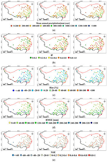 Figure 9a displayed the spatial distributions of mean annual precipitation obtained from CHIRPS, DS without gauge calibration and DS with gauge calibration, while Figure 9b–e demonstrated spatial distributions of R2, bias, RMSE and NSE, respectively, of CHIRPS data, the DS without gauge calibration and DS with gauge calibration, against ground observations, from 1990 to 1999. Generally, the spatial distributions of annual precipitation at the stations over the TP were captured well by CHIRPS, DS both without and with gauge calibration. In terms of the evaluation indices, all the precipitation products showed better agreements to ground observations in the southern and eastern TP where precipitation was relatively larger, but had poor performances in western and northern TP, where precipitation was relatively smaller. The DS with gauge calibration showed the best performance considering the strong correlations between precipitation estimates and ground observations with R2 values even >0.8 in most sites, while the R2 values of CHIRPS data were acceptable (R2 > 0.6) in the south-eastern TP, but decreased significantly in the north and south-western parts (R2 ~ 0.2). The bias and RMSE values of the DS with calibration also declined, especially over regions close to the Himalayan Mountains, compared with those of CHIRPS data. The NSE values of DS with gauge calibration also improved. These results demonstrated that the DS with gauge calibration provided more reliable precipitation estimates than CHIRPS data and DS without gauge calibration, over the TP.