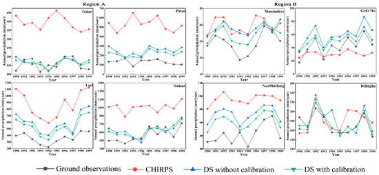 Figure 10 illustrates the comparisons of annul precipitation at the aforementioned eight stations based on ground observations, and precipitation estimates obtained from CHIRPS and the DS. The precipitation at the four stations, located in region A were poorly captured by CHIRPS data. It could be seen that CHIRPS data tended to greatly overestimate precipitation at each station in region A, which suggested that CHIRPS data could not capture the annual precipitation volumes appropriately, and provided unfavorable precipitation information in region A. The precipitation estimates obtained from DS were in better agreement with ground observations at the Gaize and Nielaer stations, compared with those of CHIRPS data. While in region B, both the CHIRPS and the DS had reasonable performances at Delingha station, however, CHIRPS data highly overestimated precipitation volumes in 1996 and 1997. Additionally, the DS captured annual precipitation well at Delingha station, such as the precipitation peak in 1992 and 1998, which indicated the better accuracy of the DS. Overall, the DS outperformed CHIRPS data in regions A and B at the specific stations.
