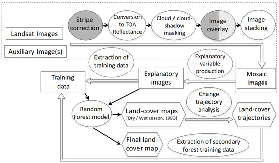 The same procedure was followed for the 1990 image that was used for land cover change analysis. This was the only image with some cloud-free areas, which allowed for a classification of the 1990s, where most secondary succession is estimated to have started [35,39]. Areas of cloud and cloud shadow remained with no data. Image preparation was conducted in ENVI and ERDAS Imagine. Image pre-processing steps are summarized in Figure 2 (dashed box).