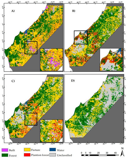 Random Forests (RF) land cover classification maps. (A) RF using predictor variables from the dry season. (B) RF using predictor variables from the wet season. (C) RF using predictor variables from the dry and wet seasons. (D) 1990 RF classification. Inset maps show locations of important transitions discussed in the text.