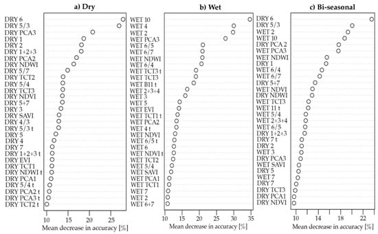 Variable importance measure for RF models with secondary forest data: (a) dry, (b) wet, and (c) bi-seasonal. Importance is estimated by mean decrease accuracy if a feature were left out in building a decision tree. For acronyms and formula details of predictor variables, see Table 1.