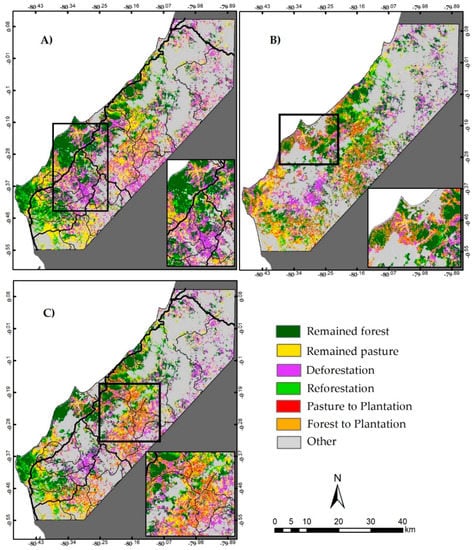 Land cover trajectories that resulted in plantation forest in 2013‒15 are important to explain differences in plantation forest percent cover and extent between the 2013‒15 cover maps. Plantations are reported to occur in areas that were formerly pasture. It is expected therefore that most plantation forest areas in 2013‒15 were pasture in 1990. Pasture in 1990 that transitioned to plantation forest in 2013‒15 accounts for 3% of the landscape in the 1990–2015 (dry season) trajectory map, 7% in the 1990–2015 (wet season) trajectory map, and 6% in the 1990–2015 (bi-seasonal) trajectory map. Areas that transitioned from forest in 1990 to plantation in 2013‒15 do not follow reported land use trajectories. It is possible that some of these areas correspond to forests cleared later in the 1990s that grew to full canopy-covered plantations, but areas where forest to plantation forest is the dominant transition might indicate areas were our models are performing poorly. That is the case of plantation areas by the coastline in the 1990–2015 (wet season) trajectory map (Figure 3B, inset map) and areas in the central portion of the landscape in the 1990–2015 (bi-seasonal) trajectory map (Figure 3C, inset map).