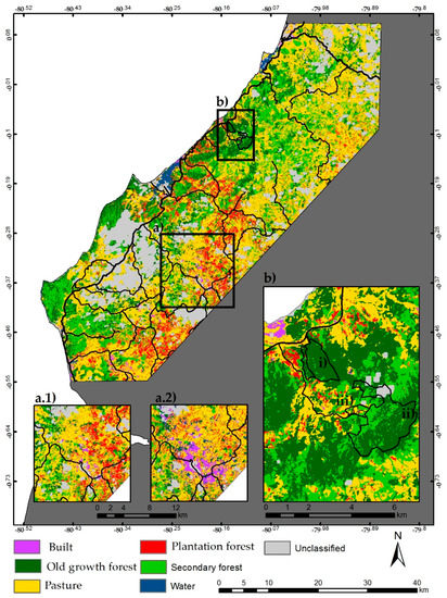 Final Random Forests (RF) land cover classification map using predictor variables from the dry and wet seasons. Inset map (a) shows areas of conflicting classification between the dry season (a.1) and bi-seasonal (a.2) models. Inset map (b) show the location of (i) Lalo Loor reserve, (ii) Jama Coaque reserve, iii) Jama Coaque areas of reforestation, native tree planting and pasture. Lines indicate primary, secondary, and tertiary roads.