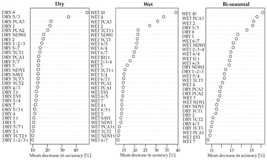 The relative importance of the 30 most important predictors in the RF with secondary forest data resembles closely that of the previous models. The thermal band as well as PCA3, single bands, and indices sensitive to differences in forest stand parameters were important [48]. The only significant difference is that the bi-seasonal model used more variables from the wet season (17) than from the dry season (13) compared to the equal number of variables from each season used in RF with no secondary forest data (Figure 7).