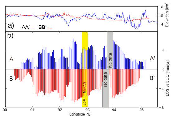 The eastern Kusai segment is located near the GCMT moment centroid, where the coseismic deformation is the largest. The maximum left-lateral surface offset of ~7.6 m was measured by field investigation [10] and InSAR data suggest ~7 m of slip along this section [11], leading to the most significant postseismic motion here observed by T133 (Figure 5d). The profiles across the fault indicate that the 2003–2010 postseismic LOS velocities reached ~13–16 mm/yr at ~93°E (Figure 6d). This is the highest postseismic velocity gradient across the fault that we have measured in this study. The data suggest a ~210-km-wide deformation zone to the south and ~100-km-wide deformation zone to the north.