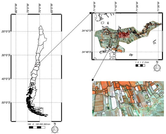 The study area comprises approximately 160 km (16,000 ha) of fragmented agricultural plots located in the Lolol Valley, O’Higgins Region, Chile (Figure 1). The region is characterized by a temperate climate, with an agricultural season between September and April (the spring-summer season). The rainfalls are concentrated in the winter months (June–August). The landscape is characterized by very diverse sizes, ranging from small-scale farms on small plots—smallholdings—(<5 ha on average) to large legally constituted entities with medium and large plots (>50 ha).