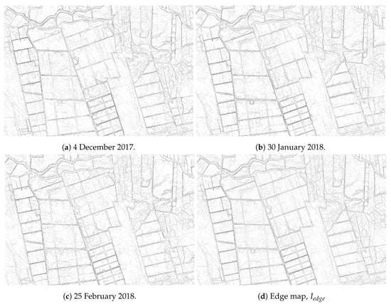 Edge maps for three dates and the edge map, , obtained by averaging the three dates’ edge maps.
