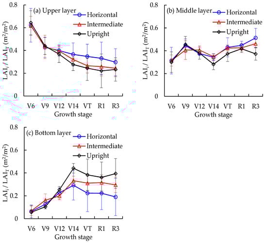 Comparison of the relative leaf area index (LAI) (LAIi/LAIT) of the vertical canopy layers for different maize plant geometry types. LAIi/LAIT represents the ratio of the subtotal leaf area of a given layer (LAIi) to the total LAI of the canopy (LAIT). (a) Upper layer; (b) middle layer; (c) bottom layer. Error bars represent standard error of the mean.