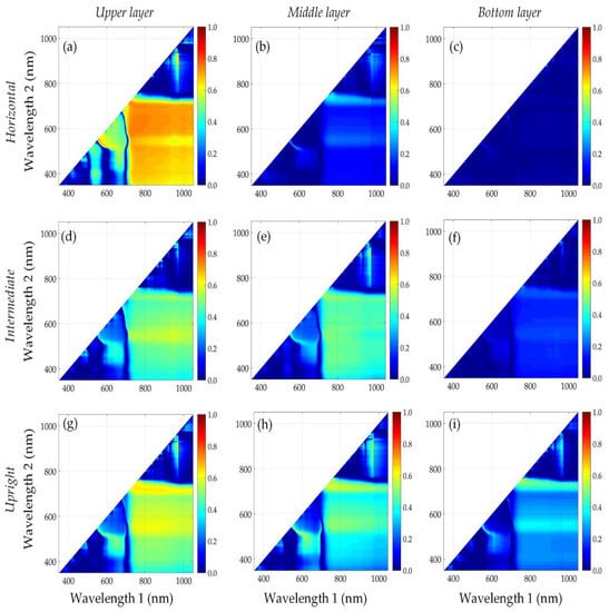 Maps showing the coefficients of determination (R2) for the relationships between the leaf N density and SR index calculated from all possible 2-band combinations in the range of 35–1050 nm across all stages. (a) The upper layer of horizontal leaf varieties; (b) the middle layer of the horizontal leaf varieties; (c) the bottom layer of the horizontal leaf varieties; (d) the upper layer of the intermediate leaf varieties; (e) the middle layer of the intermediate leaf varieties; (f) the bottom layer of the intermediate leaf varieties; (g) the upper layer of the upright leaf varieties; (h) the middle layer of the upright leaf varieties; and (i) the bottom layer of the upright leaf varieties.