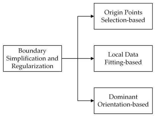 The simplification and regularization of closed boundaries or polygons for discrete points have attracted a lot of interest in the fields of photogrammetry, cartography, and computer graphics. Such procedures can be used in map simplification [21], multi-scale representation [22,23], 3D model simplification [24], building footprint generalization [25], and 3D reconstruction [26]. However, the data redundancy and noise level in building borders from ALS or photogrammetric point clouds are distinctively higher than those in digital maps, existing building footprints, or 3D models. As shown in Figure 1, generally, producing methods for building boundary simplification and regularization can be categorized into three major classes.