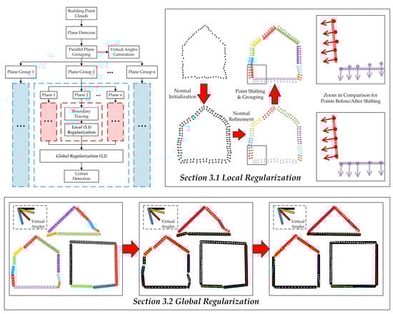 Staring from building point clouds in one region, planar structures are first extracted with simple parallel and orthogonal constraints using the existing RANSAC-based methods [61,62]. Then, the detected 3D planes that share the same normal orientations (parallel or coplanar) are grouped to conduct boundary tracing and boundary regularization, as depicted in the blue box in Figure 2. For each plane group, 3D points are projected to 2D space by translation their centroid to the origin point and rotating the normal of the plane to the positive direction of Z-axis, the consecutive boundary points of each plane, which are the input of the proposed methods, is extracted using alpha-shapes [63]. Besides, non-parallel planes are projected to each plane group to form virtual angles for subsequent global regularization.
