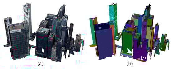 Photogrammetric point clouds and detected plans of test areas: (a) original building point clouds and (b) detected planes in the point clouds.