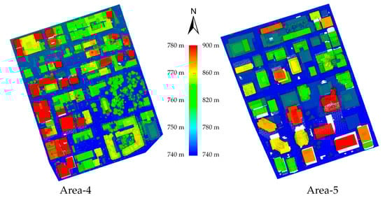 This study also tests the performance of the ALS dataset in 2D footprint generalization. The ALS data for two areas are acquired from downtown Toronto. The dataset was released by ISPRS [68] and two areas called Area-4 and Area-5 are used. Building points are extracted using existing building detection methods [71], then manually refined to correct some apparent mistakes (e.g., remove false detection and restore incomplete detection). Then, single buildings are obtained through point clustering and all of the points are projected to the ground plane to conduct boundary extraction and regularization. The ALS point clouds being tested are shown in Figure 4 and their basic information is given in Table 2.