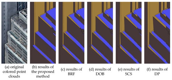 Zoom-in comparison of the regularization methods applied to photogrammetric point clouds in the red box region on the left of Figure 5. (a), original colored point clouds; (b–f), results of the proposed method, BRF [20], DOB [47], SCS [31], and DP [27] respectively.