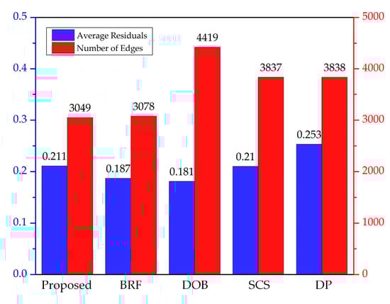 Average data fitting residuals and numbers of edges of the output polygons of the photogrammetric dataset. From left to right are the values for the proposed method, BRF [20], DOB [47], SCS [31], and DP [27], respectively.