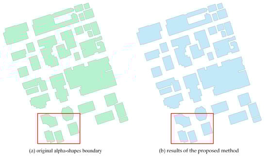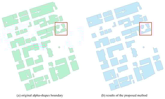 Visual comparison of the 2D building footprint generalization in Area-5. (a) original alpha-shapes boundary; (b) results of the proposed method.